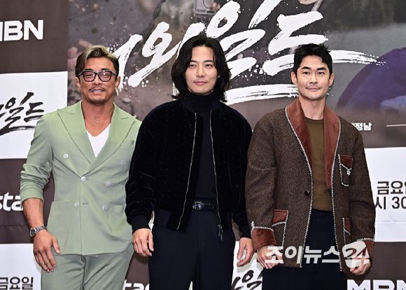 방송인 추성훈, 배우 진구, 배정남이 3일 오전 서울 상암동 스탠포드 호텔에서 진행된 MBN 새 예능 '더 와일드(THE WILD)'제작발표회에서 기념 촬영을 하고 있다. [사진=곽영래 기자]