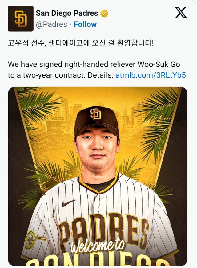 (엑스포츠뉴스 김지수 기자) 미국 메이저리그 샌디에이고 파드리스가 LG 트윈스 투수 고우석의 영입을 공식 발표했다. 한국어로 "환영합니다"라는 인사까지 건네며 KBO리그 최고의 마무리 투수를 반겨줬다.