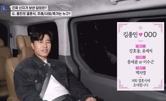 결혼식의 주례, 사회, 축가는 각각 누구일까?’라는 질문이 나오자 김종민은 “신지는 내가 누구랑 친한지 분명히 알기 때문에, 이건 답이 나올 수밖에 없다”라며 쉽게 신지를 찾아낼 수 있다고 장담했다.