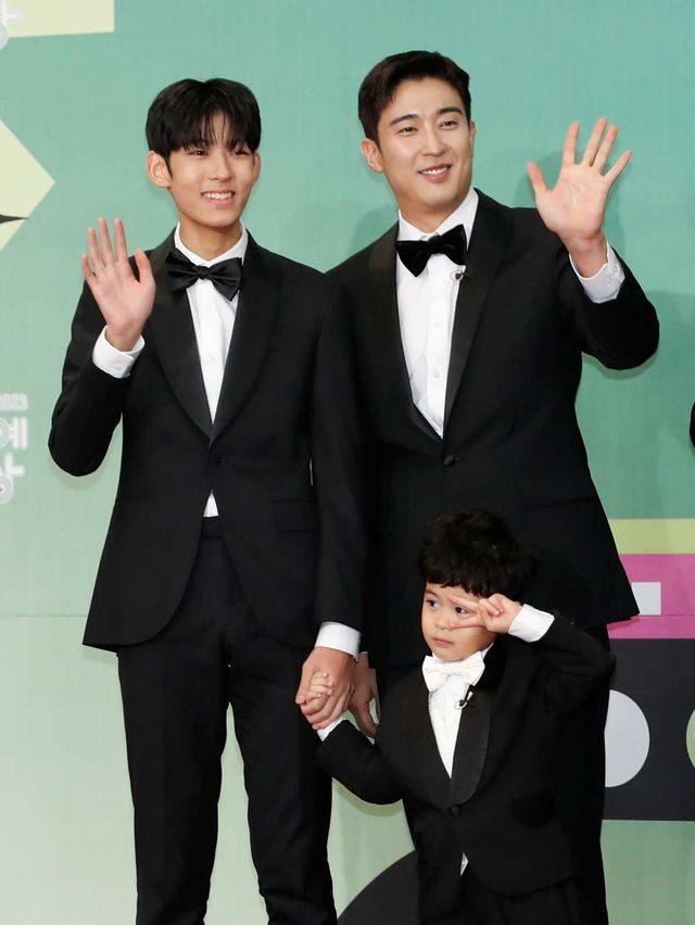 배우 강경준이 지난달 23일 오후 서울시 영등포구 여의도 KBS 신관 웨딩홀에서 열린 '2023 KBS 연예대상' 레드카펫 행사에 아들 강정안, 강정우와 함께 참석해 포즈를 취하고 있다. / 뉴스1