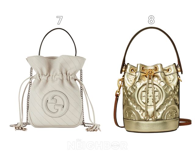 7 Gucci 화이트 레더 소재에 스티치 디테일과 기하학적으로 변형한 로고를 더한 블론디 미니 버킷백 183만원.