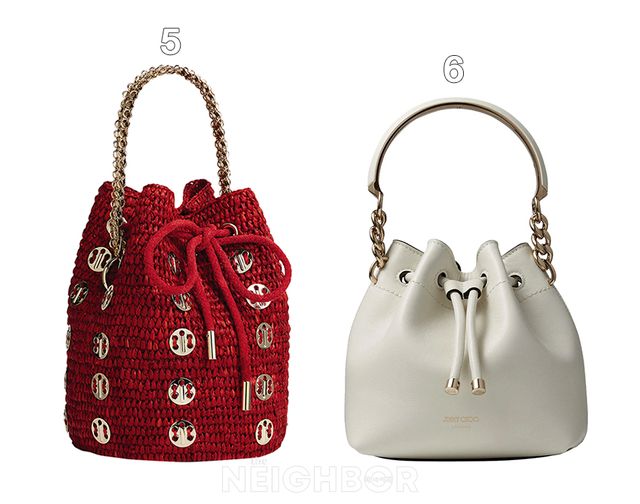 6 Jimmy Choo 메탈 하드웨어 톱 핸들을 장식한 라테 카프스킨 소재의 스몰 봉봉 버킷백 177만원.
