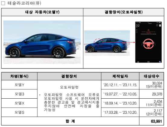 테슬라는 모델Y·모델3·모델X·모델S 등 4개 차종 63,991대는 오토파일럿 소프트웨어 오류로 리콜조치에 들어간다. 오토파일럿 기술은 차량을 자동으로 운행하도록 도와주는 주행 보조장치다.