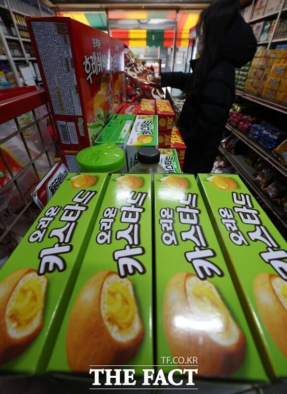 오리온이 식중독균인 황색포도산구균이 검출된 '카스타드' 제품 590여 박스에 대한 회수를 진행 중인 지난 4일 서울시내 한 식료품점에 오리온 카스타드가 진열돼 있다. /뉴시스