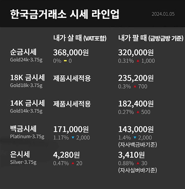 1월 5일 한국금거래소 순금 시세(VAT 포함)는 살 때 36만 8000원, 팔 때 32만 원에 거래되고 있다.