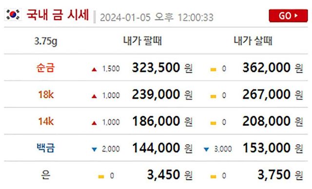 2024년 1월 5일 12시 기준 '금시세닷컴'에 시세에 따르면 팔 때 순금 시세는 전날보다 1500원 오른 32만 3500원, 살 때 시세는 전날과 같은 36만 2000원에 거래되고 있다.