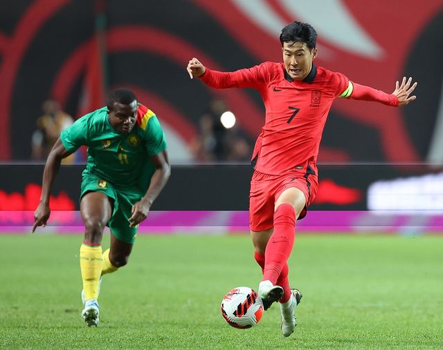 손흥민이 2022년 9월 27일 오후 서울 마포구 서울월드컵경기장에서 열린 한국 대 카메룬 축구 대표팀의 평가전에서 돌파를 시도하고 있다. / 연합뉴스