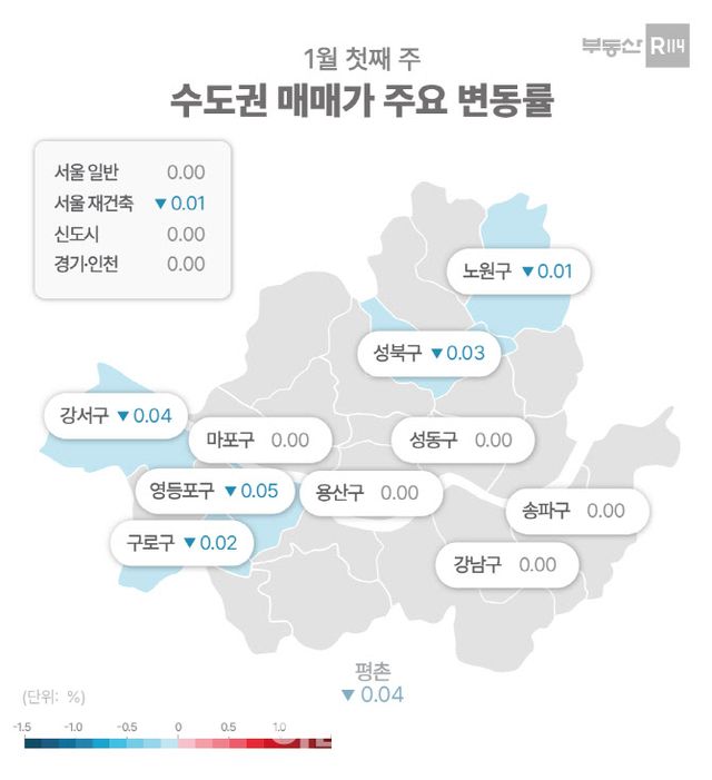 4일 부동산R114에 따르면 서울 아파트 매매가격은 4주 연속 보합(0.00%)을 뒤로 하고 0.01% 하락했다. 재건축이 0.01% 떨어졌고 일반 아파트는 가격 움직임이 없었다. 신도시와 경기·인천은 동반 보합세를 나타냈다.