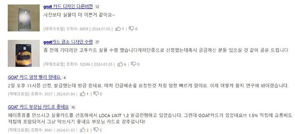 6일 카드업계에 따르면 최근 고트카드를 발급했다는 소비자 인증 글들이 속속 올라오고 있다. 고 혜택 카드가 잇달아 단종되는 상황에서 쏠쏠한 혜택을 담은 카드가 등장했다는 평가다.