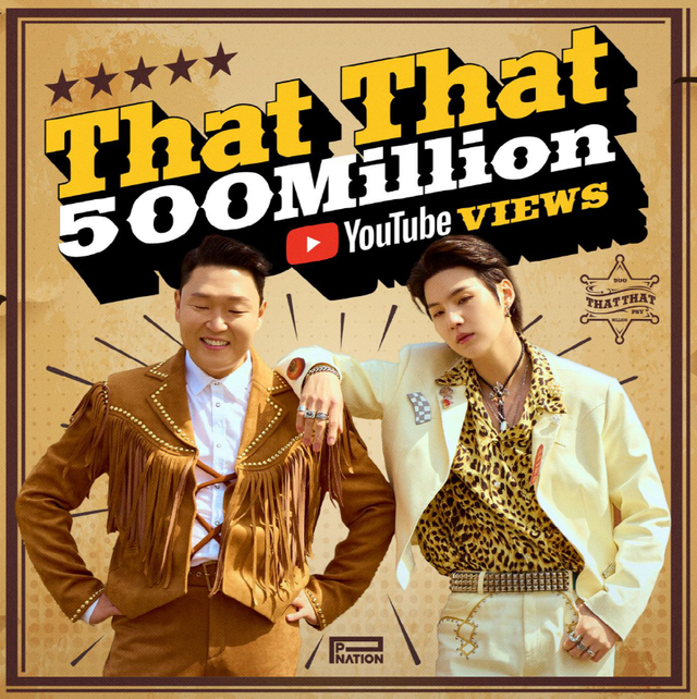 6일, 싸이의 소속사 피네이션은 그의 정규 9집 앨범 '싸다9'의 타이틀곡 '댓댓(That That) (prod. & feat. SUGA of BTS)' 뮤직비디오가 5억 뷰를 돌파했다고 발표했다. 이 곡은 싸이와 BTS의 슈가가 공동으로 프로듀싱하였으며, 트렌디하고 중독성 있는 멜로디로 전 세계적인 사랑을 받았다.