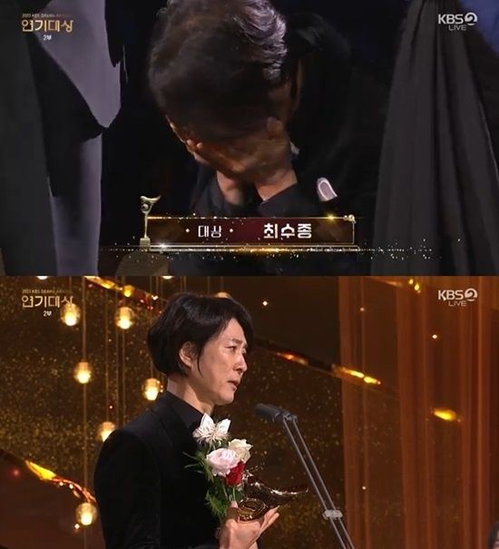 최수종은 대상을 수상하며 10년 만에 KBS 사극 복귀 부담을 털어놓기도. 그는 "모든 분들이 제가 사극을 하면 당연이 될 거라 말씀하시지만 큰 부담감 안고 아닌 척 한다. 오히려 후배들보다 대본을 수십, 수백 번 더 본다. 모든 후배들이 절 지켜보기에 조금 더 잘하려고 한다"고 전해 큰 박수를 이끌어냈다.