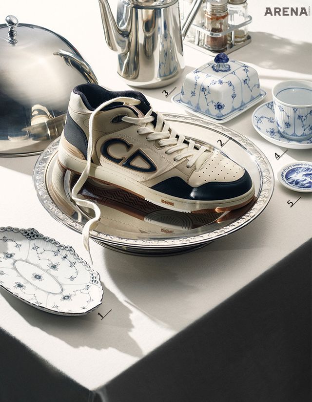 <b>1·3·4·5</b> 블랙 하프 레이스 오벌 접시 37만원·블루 플레인 빈티지 버터 디시 25만3천원·블루 플레인 하이핸드 컵앤소서 25만원·블루 컬렉터블 2024 플라켓 18만5천원 모두 로얄코펜하겐 제품. <br><b>2</b> 베이지 스웨이드 B57 스니커즈 가격미정 디올 맨 제품.