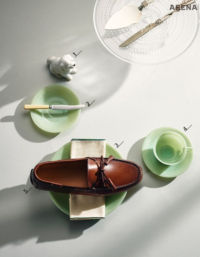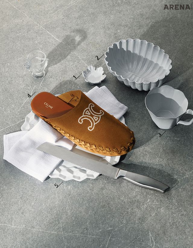 <b>1·2·3·5</b> 슈 플레이트 12만9천원·빅토리아 볼 22만8천원·마가렛 초콜릿 컵 25만7천원·큐브 사이드 플레이트 18만3천원 모두 아스티에 드 빌라트 제품. <br><b>4</b> 스웨이드 카프스킨 소재의 트리옹프 뮬 가격미정 셀린느 옴므 제품.