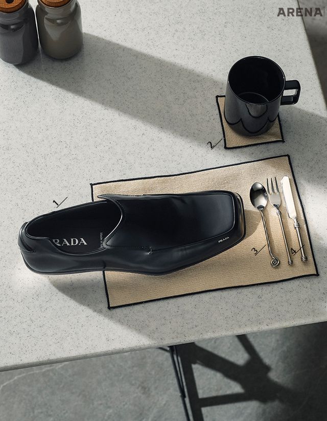 <b>1</b> 검은색 스퀘어 토 로퍼 가격미정 프라다 제품. <br><b>2·3·4 </b>검은색 라이닝 디테일의 티 매트 세트 2만5천원·디저트 스푼, 별도의 디저트 포크가 포함된 세트 2만3천원·디저트 포크, 버터 나이프에 별도의 스푼까지 포함된 커틀러리 세트 3만원 모두 스튜디오 테이스트 제품.