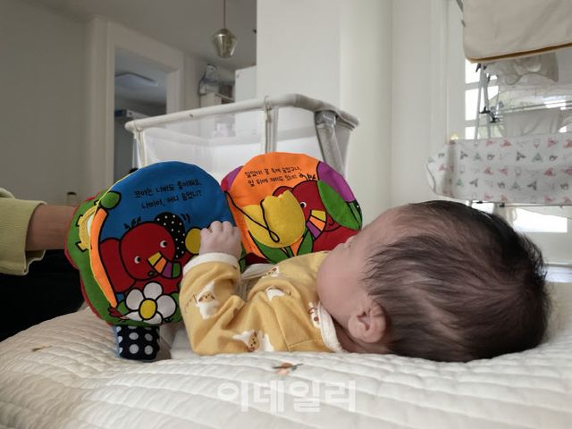 ‘아기코끼리 코야’ 책도 반응이 좋은 아이템이다. 아기코끼리 코야는 책이라기보다 다양한 감각을 느낄 수 있는 교구에 가깝다. 겉은 면인데 안에는 비닐이 들어있는지 바스락거리는 소리를 낸다. 이외에도 뽁뽁이 소리, 치발기 등 다양한 감각을 느낄 수 있게 구성돼 있다. 우린 아이를 역류방지쿠션(역방쿠)에 눕힌 뒤 코야를 허벅지와 배 사이에 놓고 보게 하고 있다. 책 자체를 손으로 비벼 바스락거리는 소리를 내 집중을 유발하고, 이후에는 아이 스스로 알록달록한 색감 때문인지 유심히 본다. 100일이 넘은 현재는 아이가 손으로 만지면 가끔 책을 스스로 넘길 때도 있다. 신생아 초기에는 감각 놀이가 중요한데 코야는 이걸 충족해 주고, 현재까지도 가장 집중도가 높은 책이기도 하다. 코야는 아이가 색깔을 인식할 수 있는 1개월 이후부터 반응했다.
