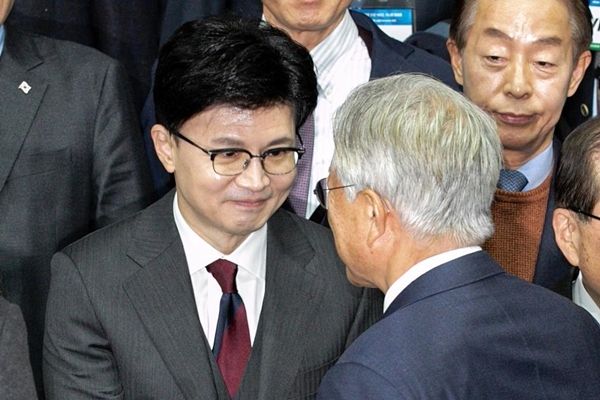 문재인 전 대통령과 악수하는 한동훈 국민의힘 비상대책위원장 / 뉴스1