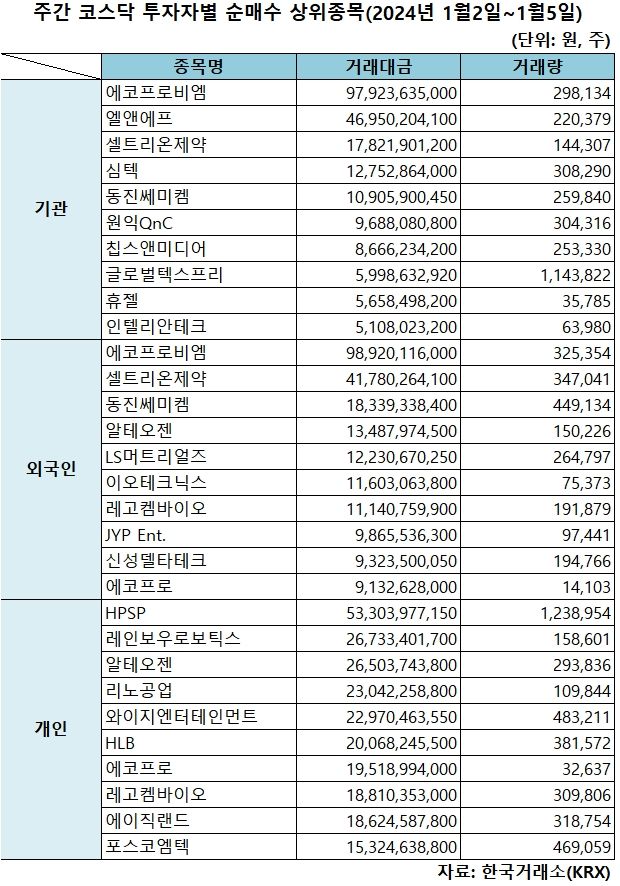 기관 '에코프로비엠'·외인 '에코프로비엠'·개인 'HPSP' 1위 [주간 코스닥 순매수- 1월2일~1월5일]