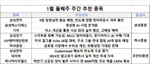이혁진 삼성증권 연구원은 이번주의 투자 포인트로 '2024년 주도주 찾기'를 제시하며 "1월에 강한 업종과 테마가 올해의 주도주가 될 가능성이 높다"고 말했다.