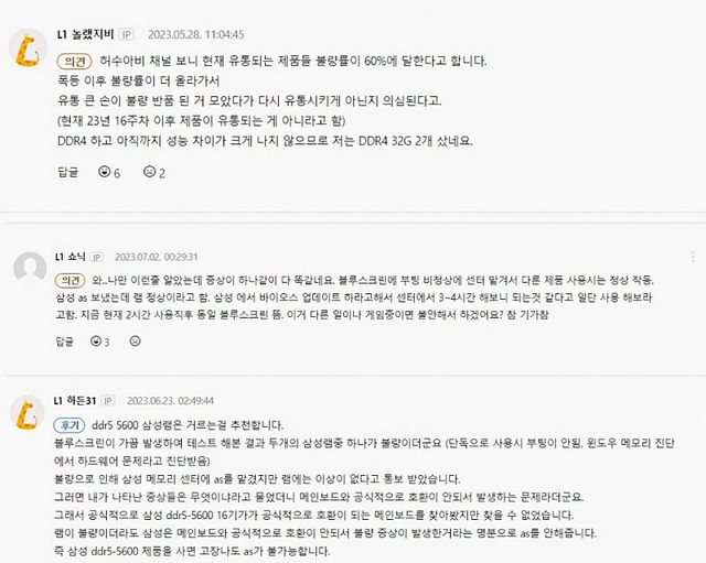 △ 유통되는 삼성전자 메모리 제품 가운데 불량률이 60%에 달한다는 주장도 나오는 상황. 분위기는 사지 마라는 여론으로 상당수 기울었다. DDR5 메모리에서 삼성의 위상은 회북이 불가능해졌다.