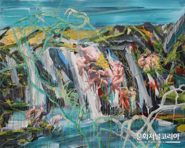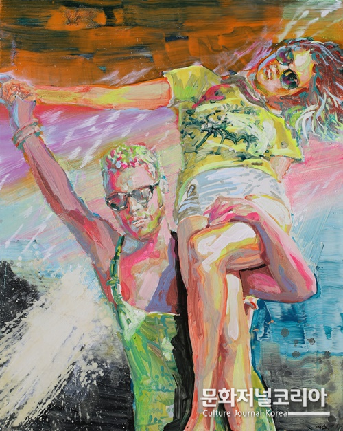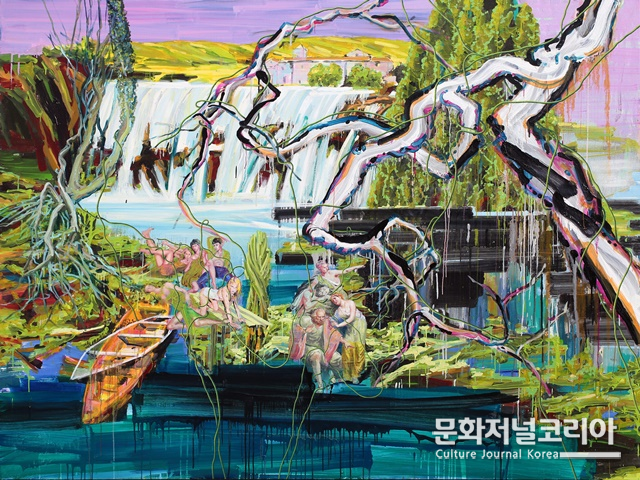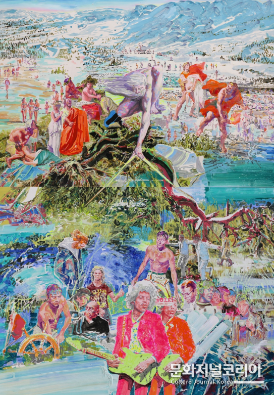 신작 <낯선 곳의 일탈자들>(2023)은 낯선 시공간과 여러 형상이 다층적으로 병치된 대형 회화이다. 화면 속 다양한 요소들은 마치 가장 자유로운 세계 어느 곳에서 각자 자신만의 리듬 속에서 춤을 추는 것처럼 보인다.