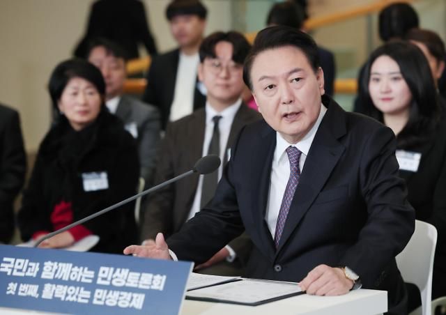 本月4日,尹锡悦在位于京畿道龙仁市的中小企业人力开发院出席民生讨论会。【图片提供 韩联社】