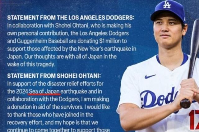 최근 오타니 쇼헤이(30)를 영입한 LA 다저스가 일본 지진 피해 기부 계획 소식 중 동해를 일본해로 표기해 논란을 일으켰다.