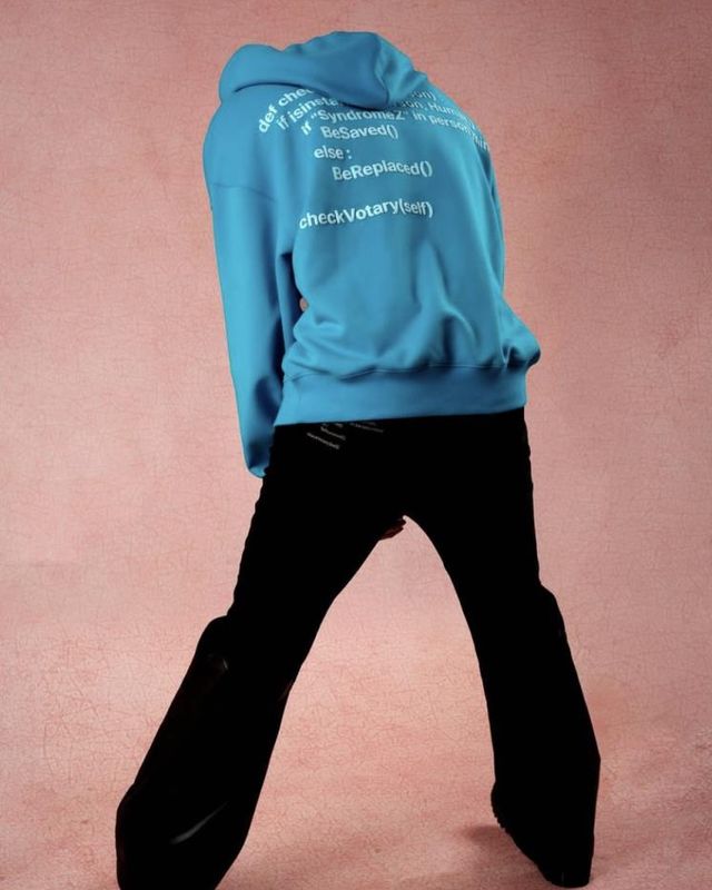 ‘신드롬즈’의 첫 컬렉션은 “REJOICE! We will be replaced (기뻐하라! 우리는 모두 대체될것이다.)”라는 주제로, AI의 발전이 인류를 구원할 수 있을 것이라는 메시지를 담고 있습니다. 주제에 걸맞게 후디 등 의류에 프린팅 되어 있는 문구는 파이썬 코드라고 합니다.