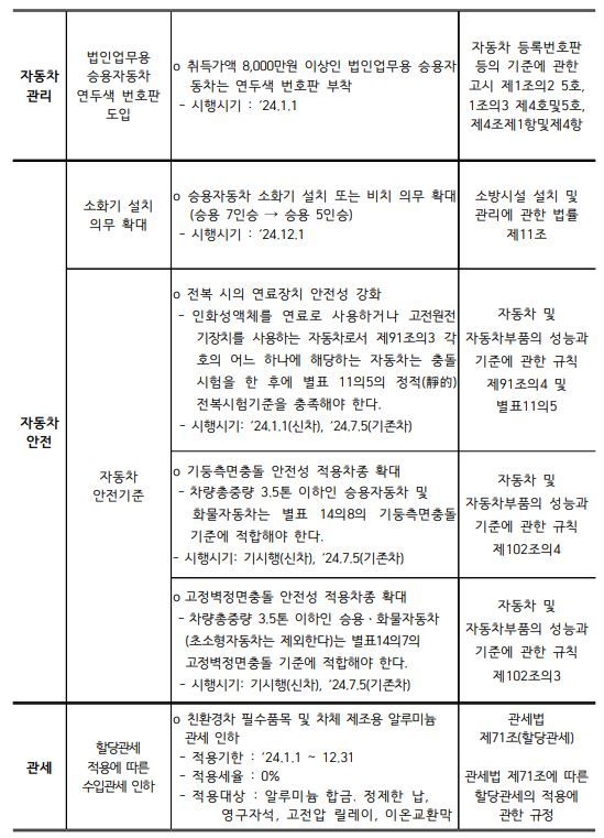 자동차 안전기준 부문에서는 24.12월부터 현재 7인승 이상 승용차에 부과되던 소화기 설치 또는 비치 의무가 5인승 승용차까지 확대될 예정이다. 또한 할당관세 품목에 영구자석, 이온교환막 등 친환경차 필수품목이 추가되어 영세율이 적용된다.
