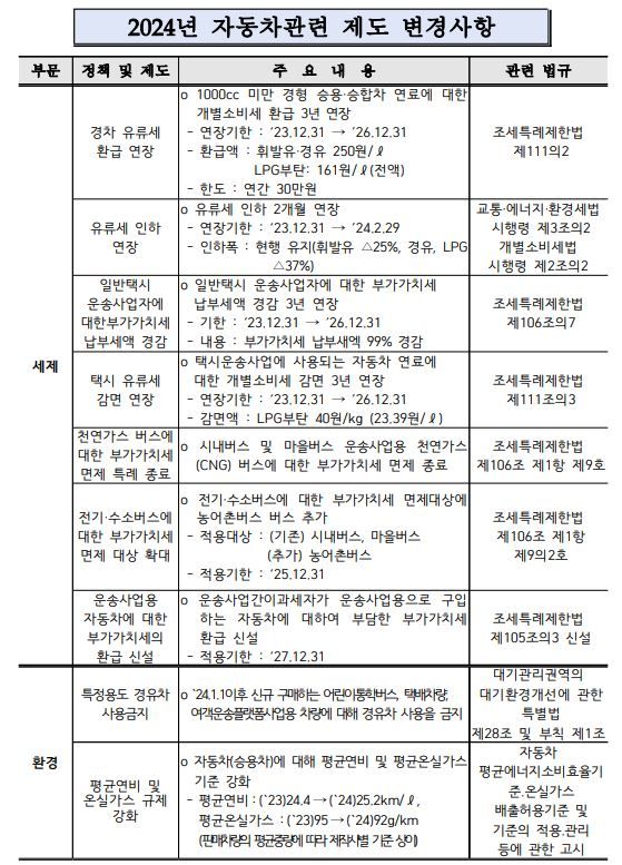 주요 내용을 보면 우선 1000cc 미만 경형 승용승합차 연료에 대한 개별소비세 환급이 3년 연장되어 ‘26년 말까지 지속된다. ’23년 말 종료 예정이던 유류세 인하는 2개월 연장되어 ‘24년 2월 말 종료 예정이다.