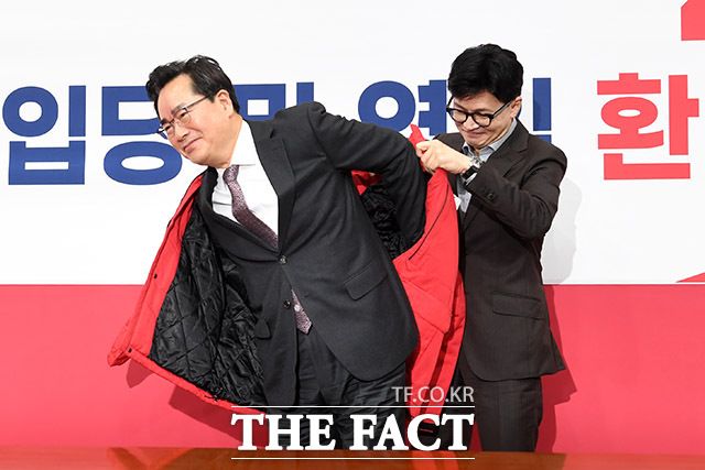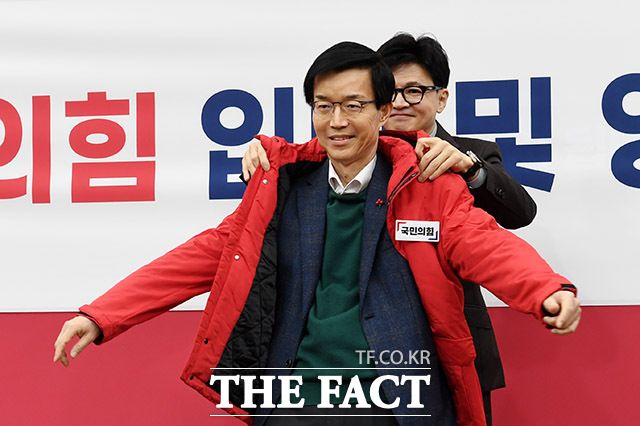 국민의힘 점퍼 입는 방문규 전 산업통상자원부 장관(왼쪽).