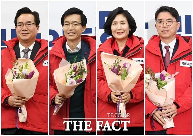 [더팩트ㅣ국회=남용희 기자] 정황근 전 농림부 장관과 방문규 전 산업통상자원부 장관, 이기순 전 여성가족부 차관, 김완섭 전 기획재정부 차관(왼쪽부터)이 8일 오전 서울 여의도 국회에서 열린 국민의힘 입당 및 영입 환영식에서 기념촬영을 하고 있다.