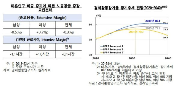 그러면서 "미혼인구 비중 증가세가 지속하면 경제 활동 참가율 장기 추세의 정점 시점이 당겨지고 정점 수준은 낮아지며 정점 이후 감소 속도는 가팔라진다"고 내다봤다.