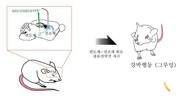 연구팀은 이 편도체가 신호를 보내는 여러 부위 중 강박장애와 그 유관질병들과 관련이 있다고 알려진 피질-선조체-시상-피질 회로의 한 축을 담당하는 선조체에 초점을 맞춰 광유전학 실험을 진행했다.