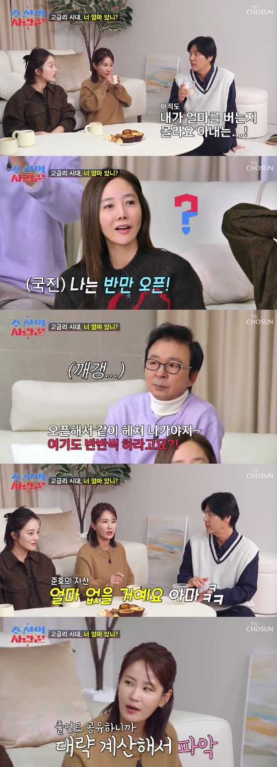 이를 신기하다는 듯 지켜보던 최성국은 "저런 걸 이야기하는 구나"라고 감탄했다. 그는 "난 아직도 내가 얼마를 버는지 아내가 모른다. 내 통장에 얼마가 있고, 출연료가 어느 정도인지 모른다. 물어본 적도 없고 궁금해하지도 않는다"고 밝혀 놀라움을 자아냈다.