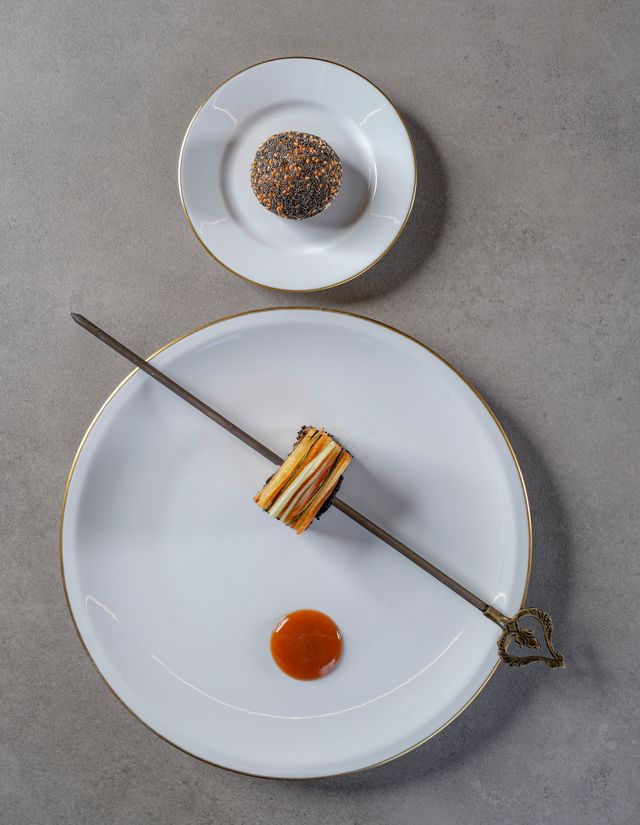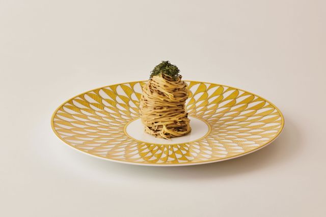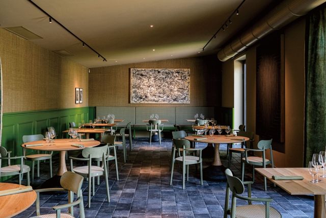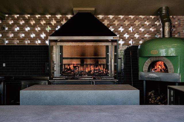 실내는 나무와 석재 같은 재료를 녹색과 건초 색조로 마감해 주변 시골 풍경의 녹음을 고스란히 안으로 들였다. 눈에 보이는 것만 자연친화적으로 꾸 민 건 아니다. 영향력 있는 요리사의 위치에 오른 뒤부터 지속 가능 한 요리를 고민하고, 친환경 자선단체 활동을 이어온 그는 이곳 또 한 지속 가능한 환경을 염두에 두고 설계했다. 지붕에는 85kW 태양광 패널을 설치했으며, 마페이 세라믹 타일을 활용해 빗 물을 재활용한다. 장작을 태우는 오븐에도 배기가스를 줄이 는 무공해 탱크를 장착했다. 공간 조명은 디자이너 다비데 그 로피가 맡아 램프를 국자 모양으로 위트있게 디자인했다. 이 외에도 리바1920 테이블, 토넷 의자 등 가구를 고르는 데에 도 심혈을 기울였다. 다이닝 홀 벽에는 개념미술가 마이크 비들로 의 ‘Not Pollock’ 작품이 걸려 있는데, 이곳의 요리 콘셉트 ‘Not Barbecue’는 이 작품에서 영감을 받아 지은 이름이다. 오스테리 아 프란체스카나, 구찌 오스테리아, 페라리의 레스토랑 카발리뇨 등 그간 보투라의 레스토랑에서 선보인 요리와 완전히 다른 콘셉트로 화덕과 장작 그릴을 사용한 음식을 선보인다. 이를테면 보투라의 시 그너처인 파르미지아노 소스를 바른 토르텔리니를 서빙 직전 장작 오븐에 구워 밤나무 훈연 향을 입히는 식이다. 대표 메뉴로는 이탈리 아 소시지 코테키노에 훈연 향을 더하고 히비스커스꽃으로 만든 붉 은 소스를 곁들이는 ‘코테키노와 용의 피’가 있다.