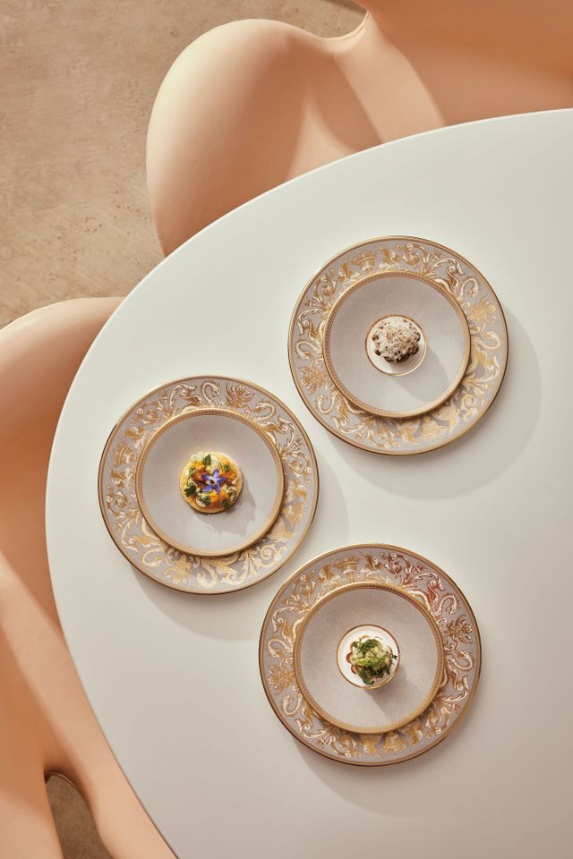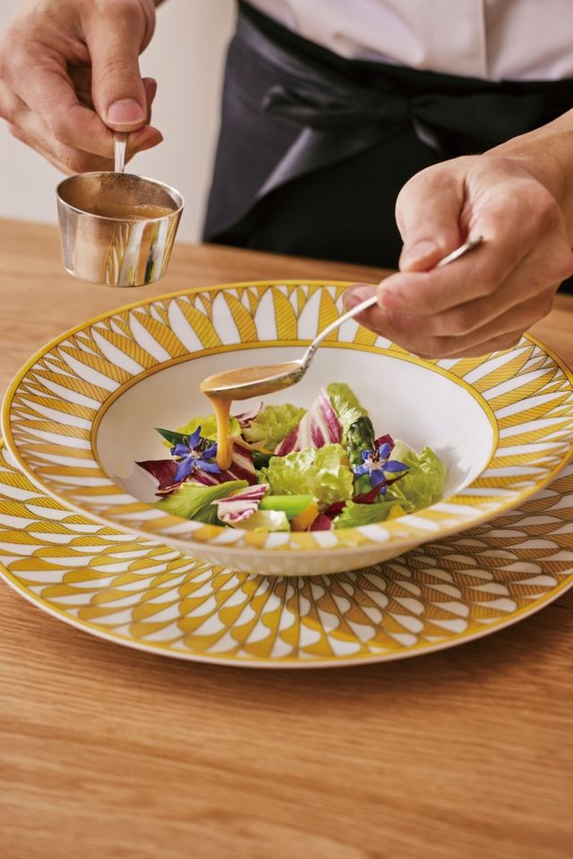 한국에 ‘르 그랑 베푸르’ 같은 공간이 생겼다. 르 그랑 베푸르는 나폴레옹과 조세핀 황후가 데이트했던 자리도 남아 있는, 유구한 역사를 이어온 프랑스 레스토랑이다. 팬데믹을 지나면서 이곳은 과감하게 콘셉트를 바꿨다. 가격대 높은 코스가 아닌, 부담 없이 단품 요리를 주문할 수 있는 비스트로 스타일을 택한 것. 혁신적 변화는 성공적이었고, 르 그랑 베푸르는 현재 전통과 현대가 공존하는 모습으로 사랑받고 있다. 데땅듀는 바로 그런 곳이다. 늘 요리의 다음 신은 무엇일지 생각하는 장진모 셰프, 좋은 공간과 브랜드를 만들기 위해 고민하는 컨설팅 에이전시 ‘플라야’ 김영권 대표가 손잡고 만들었다. 처음 공간을 꾸릴 때 음식의 장르는 정해두지 않았다고. 두 사람이 추구하는 방향을 나눈 뒤, 장진모 셰프가 정통 프렌치를 택했다. 셰프는 파인다이닝이 지속 가능한지 계속 물음표를 던졌고, 세계 다이닝 신 중심인 프랑스가 고민하는 다음 지점이 어디인지 살폈다. 그러다 250년의 역사를 계승하되 현대적으로 공간과 요리를 발전시킨 르 그랑 베푸르를 떠올렸다. 기물은 과거 빈티지나 벨 에포크 시대의 영향을 받은 제품을 사용하고자 했다. 접시는 아르데코 패턴을 재해석한 에르메스 솔레일 데르메스 컬렉션과 웨지우드의 옐로우리본을, 커틀러리는 양각 디자인을 새긴 크리스토플의 쟈뎅 에덴을 사용했다. 그 외 서빙 피스나 캐비아 스푼은 빈티지 퓌포르카로 구했다. 접시와 커틀러리가 과거 프랑스 어느 가정에서 썼을 법한 모양이라 모던한 인테리어 속에 있으면 더 특색 있을 거라고 생각했다.