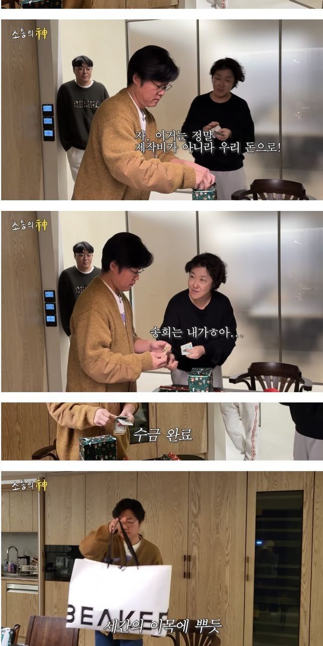 자기들 팀에서 고생한 드라마팀 작가 선물도 준비했는데 갑자기 드라마팀 고참이 와서 서로 돈내겠다면서 싸우는 상황