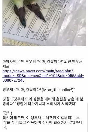 해외에서 마약사범이 키우던 앵무새가 마약 사범인 주인을 도우려 "Mom, the police(엄마 경찰이다!)" 라고 외친 앵무새를 체포했다고 밝혔다.