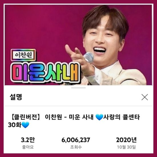 이 영상은 이찬원이 '사랑의 콜센타' 30회에서 선보인 무대의 클린 버전으로, 해당 회차에서 이찬원은 원곡자인 유지나와 함께했다.