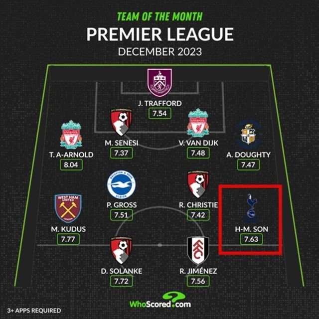 ‘후스코어드닷컴’은 지난 1일, 홈페이지를 통해 2023-24시즌 프리미어리그 12월 베스트 일레븐을 공개했다. 본머스 소속이 3명으로 가장 많았으며, 리버풀도 두 명을 배출했다. 이 밖에 토트넘, 번리, 루턴 타운, 웨스트햄 유나이티드, 브라이튼, 풀럼 선수도 이름을 올렸다. 선정 방식은 12월 경기에서의 평균 평점이다.