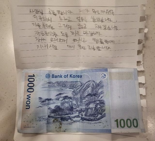그러나 이후 저녁에 매장을 정리하러 간 A씨는 선반 위 꼬깃꼬깃 접힌 종이 한 장과 함께 1000원짜리 지폐를 발견했다.