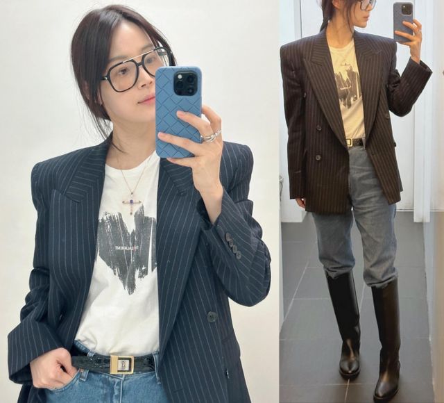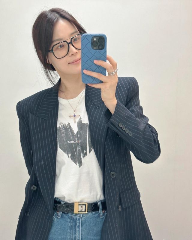 한지혜는 빈티지한 프린팅이 돋보이는 화이트 셔츠에 청바지와 롱부츠를 매치하고, 네이비 핀스트라이프 패턴 파워숄더 재킷을 걸쳐 매니시 무드의 세련된 패션을 선보였다. 여기에 독특한 프레임 안경을 착용해 스타일리시한 포인트를 줬다.