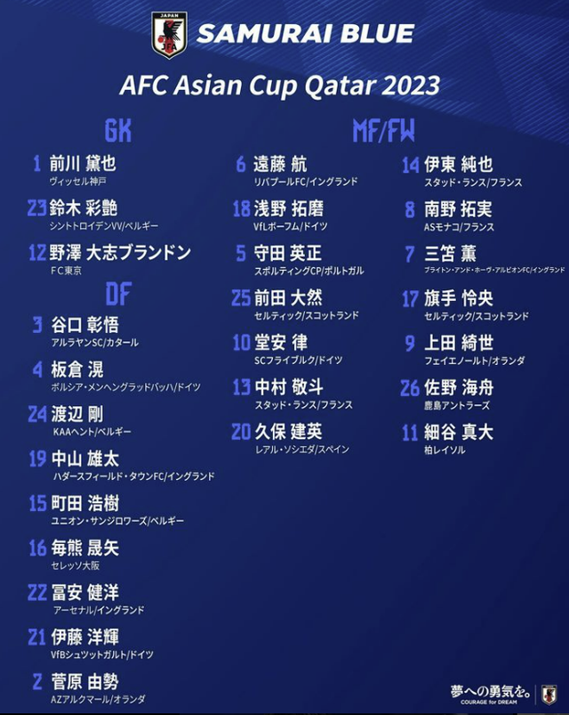 ◆2023 카타르 아시안컵 일본축구대표팀 최종엔트리(26명)