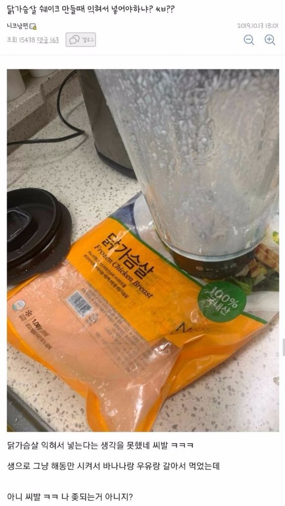 이런 닭가슴살 쉐이크를 특이하게 먹은 헬스갤러리 회원이 화제가 되고있다.