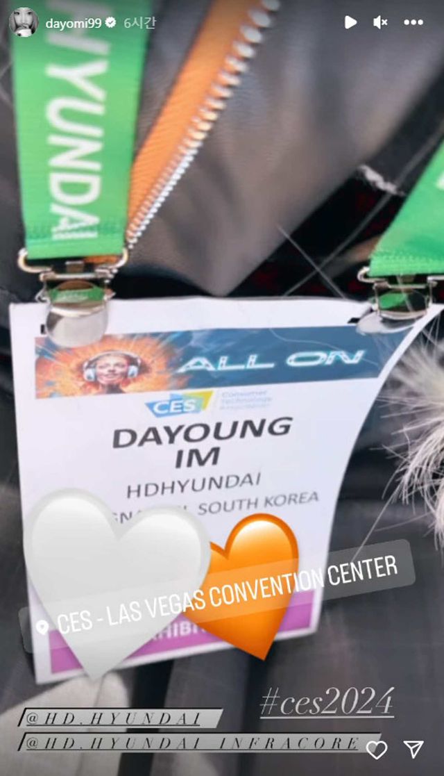 다영은 11일(한국 시각) 오전 인스타그램 스토리에 CES 현장 사진들을 올리며 이색 근황을 알려 눈길을 끌었다. 올라온 사진들에는 다영이 HD현대 이름이 적힌 정식 명찰을 걸고 있는 모습, 현장 인파들 속에 섞여 남긴 인증샷 등이 담겨 있어 시선을 사로잡았다.