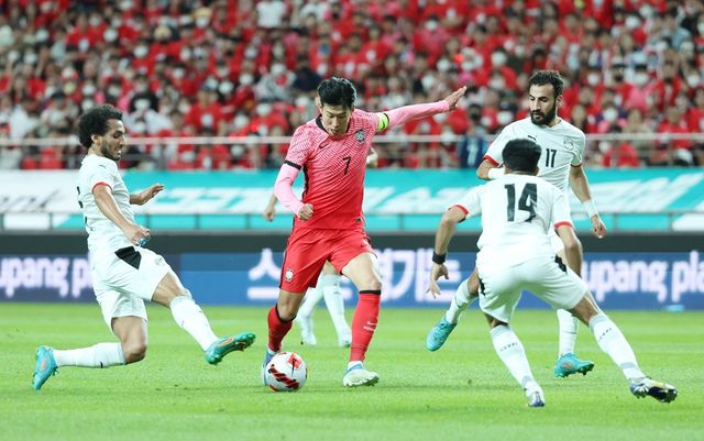 2022년 6월 14일 오후 서울 마포구 서울월드컵경기장에서 열린 남자 축구 국가대표팀 친선경기에서 이집트 수비들이 손흥민을 둘러싸고 수비하고 있다. / 연합뉴스
