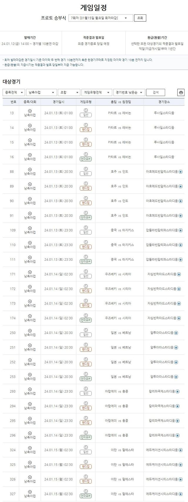 먼저 프로토 승부식 7회차는 12일(금) 오후 2시부터 발매를 개시한다. 대상경기는 아시안컵 개막전인 카타르-레바논(13~16번)전을 비롯해 호주-인도(88~91번), 중국-타지키스탄(109~111번), 우즈베키스탄-시리아(171~174번), 일본-베트남(250~253번), 아랍에미레이트-홍콩(293~296번), 이란-팔레스타인전(324~327번) 등이 선정됐다.