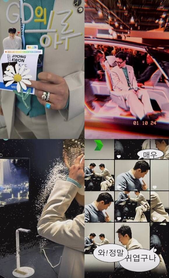지난 9일 미국 라스베이거스에서 열린 세계 최대 가전·IT 전시회 'CES 2024'에 참석한 지드래곤은 지난 10일 자신의 인스타그램 스토리에 사진과 동영상을 공개했다. 여러 부스를 다니며 직접 체험하는 모습이 담겼고 정기선 HD현대 부회장과 만나기도 했다.