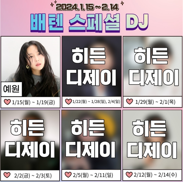 오는 15일(월)부터 19일(금)까지는 가수 겸 배우로 활약 중인 예원이 마이크를 잡고 스페셜 디제이로서 색다른 매력을 선보인다. 예원은 본업인 연기와 노래 외에도 남다른 예능감으로도 대중의 사랑을 받고 있는 만큼 벌써부터 청취자들의 기대가 커지고 있다.