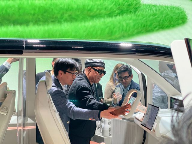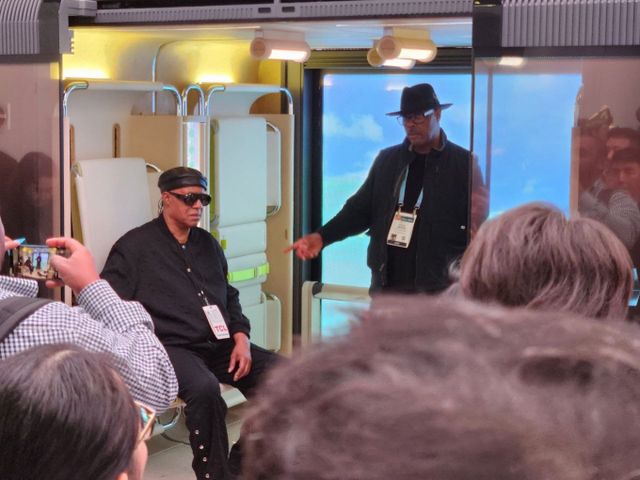 스티비 원더는 이날 오후 5시10분쯤 기아 부스를 먼저 찾아 15분 정도 머물며 목적기반 모빌리티(PBV) 콘셉트 모델인 PV5 베이직의 내·외장과 기능들을 체험했다.